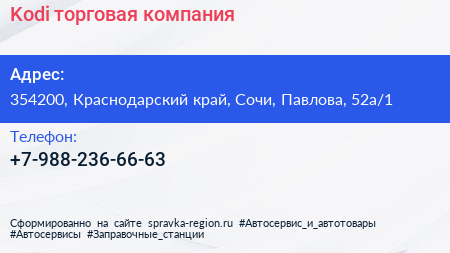 Kodi, торговая компания по адресу 354200, Краснодарский край, Сочи, Павлова, 52а/1 в дальнейшем Организация, размещена в следующих категориях: