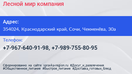 Лесной мир, компания по адресу 354024, Краснодарский край, Сочи, Чекменёва, 30а в дальнейшем Организация, размещена в следующих категориях: