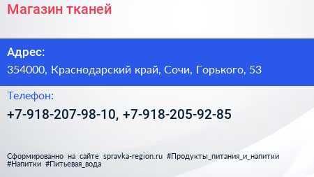 Магазин тканей по адресу 354000, Краснодарский край, Сочи, Горького, 53 в дальнейшем Организация, размещена в следующих категориях: