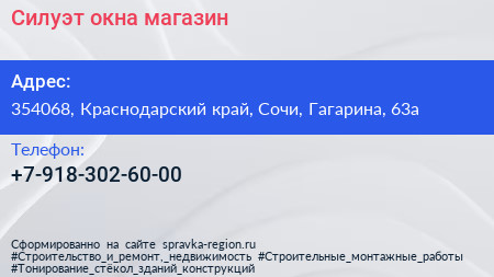 Силуэт окна, магазин по адресу 354068, Краснодарский край, Сочи, Гагарина, 63а в дальнейшем Организация, размещена в следующих категориях: