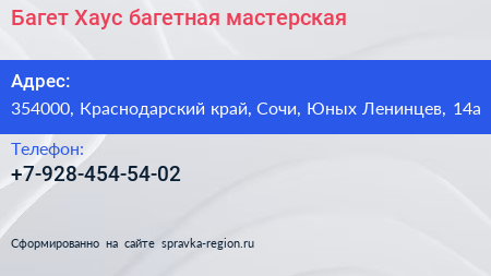 Багет Хаус, багетная мастерская по адресу 354000, Краснодарский край, Сочи, Юных Ленинцев, 14а в дальнейшем Организация, размещена в следующих категориях:
