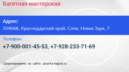 Багетная мастерская по адресу 354068, Краснодарский край, Сочи, Новая Заря, 7 в дальнейшем Организация, размещена в следующих категориях: