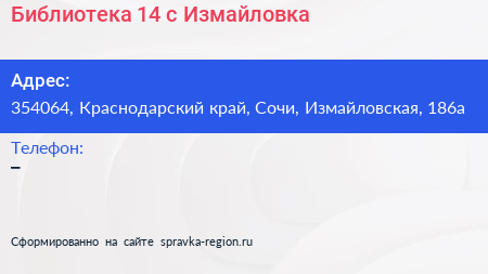 Библиотека №14, с. Измайловка по адресу 354064, Краснодарский край, Сочи, Измайловская, 186а в дальнейшем Организация, размещена в следующих категориях: