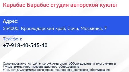 Карабас Барабас, студия авторской куклы по адресу 354000, Краснодарский край, Сочи, Москвина, 7 в дальнейшем Организация, размещена в следующих категориях: