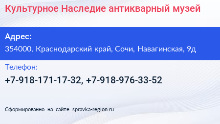Культурное Наследие, антикварный музей по адресу 354000, Краснодарский край, Сочи, Навагинская, 9д в дальнейшем Организация, размещена в следующих категориях:
