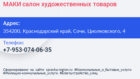 МАКИ, салон художественных товаров по адресу 354200, Краснодарский край, Сочи, Циолковского, 4 в дальнейшем Организация, размещена в следующих категориях: