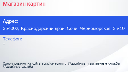 Магазин картин по адресу 354002, Краснодарский край, Сочи, Черноморская, 3 к10 в дальнейшем Организация, размещена в следующих категориях: