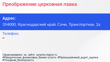 Преображение, церковная лавка по адресу 354000, Краснодарский край, Сочи, Транспортная, 2а в дальнейшем Организация, размещена в следующих категориях: