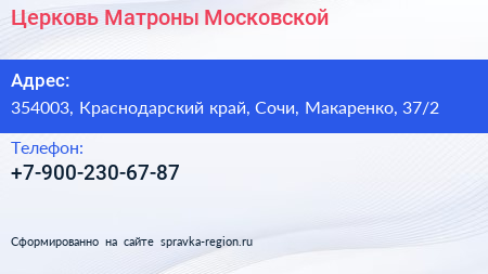Церковь Матроны Московской по адресу 354003, Краснодарский край, Сочи, Макаренко, 37/2 в дальнейшем Организация, размещена в следующих категориях: