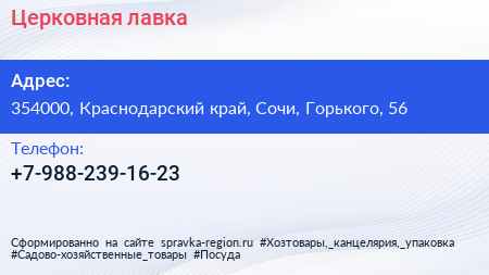 Церковная лавка по адресу 354000, Краснодарский край, Сочи, Горького, 56 в дальнейшем Организация, размещена в следующих категориях: