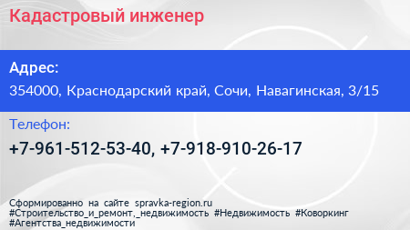 Кадастровый инженер по адресу 354000, Краснодарский край, Сочи, Навагинская, 3/15 в дальнейшем Организация, размещена в следующих категориях: