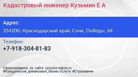Кадастровый инженер Кузьмин Е.А. по адресу 354200, Краснодарский край, Сочи, Победы, 64 в дальнейшем Организация, размещена в следующих категориях: