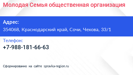 Молодая Семья, общественная организация по адресу 354068, Краснодарский край, Сочи, Чехова, 33/1 в дальнейшем Организация, размещена в следующих категориях: