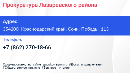 Прокуратура Лазаревского района по адресу 354200, Краснодарский край, Сочи, Победы, 113 в дальнейшем Организация, размещена в следующих категориях: