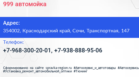 999, автомойка по адресу 354002, Краснодарский край, Сочи, Транспортная, 147 в дальнейшем Организация, размещена в следующих категориях: