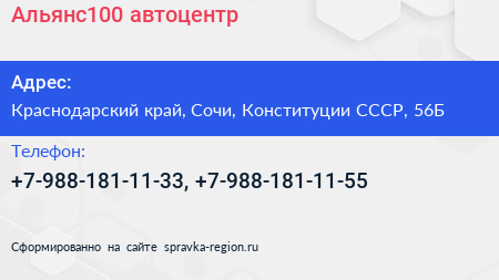 Альянс100, автоцентр по адресу Краснодарский край, Сочи, Конституции СССР, 56Б в дальнейшем Организация, размещена в следующих категориях: