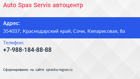 Auto Spas Servis, автоцентр по адресу 354037, Краснодарский край, Сочи, Кипарисовая, 8а в дальнейшем Организация, размещена в следующих категориях: