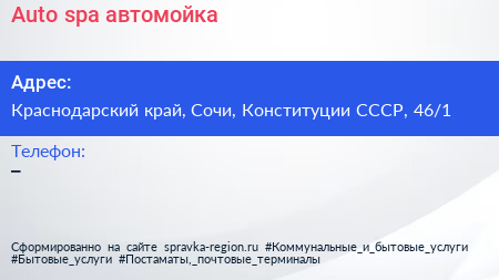 Auto spa, автомойка по адресу Краснодарский край, Сочи, Конституции СССР, 46/1 в дальнейшем Организация, размещена в следующих категориях: