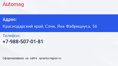 Automag по адресу Краснодарский край, Сочи, Яна Фабрициуса, 56 в дальнейшем Организация, размещена в следующих категориях: