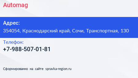 Automag по адресу 354054, Краснодарский край, Сочи, Транспортная, 130 в дальнейшем Организация, размещена в следующих категориях: