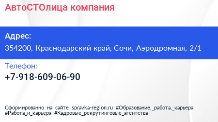 АвтоСТОлица, компания по адресу 354200, Краснодарский край, Сочи, Аэродромная, 2/1 в дальнейшем Организация, размещена в следующих категориях: