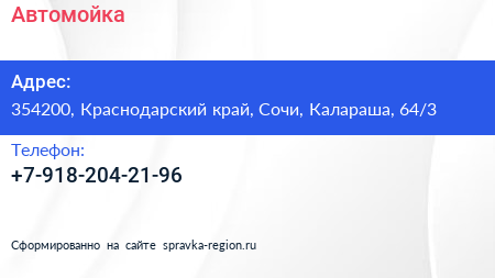 Автомойка по адресу 354200, Краснодарский край, Сочи, Калараша, 64/3 в дальнейшем Организация, размещена в следующих категориях: