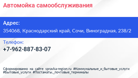 Автомойка самообслуживания по адресу 354068, Краснодарский край, Сочи, Виноградная, 238/2 в дальнейшем Организация, размещена в следующих категориях: