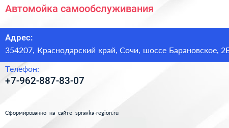 Автомойка самообслуживания по адресу 354207, Краснодарский край, Сочи, шоссе Барановское, 2Б в дальнейшем Организация, размещена в следующих категориях:
