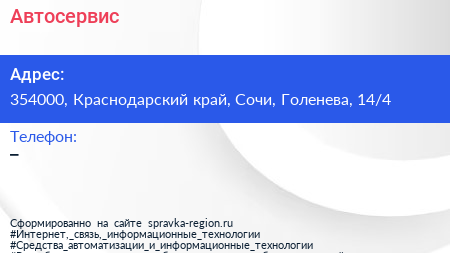 Автосервис по адресу 354000, Краснодарский край, Сочи, Голенева, 14/4 в дальнейшем Организация, размещена в следующих категориях: