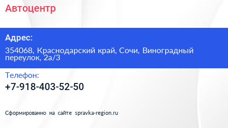 Автоцентр по адресу 354068, Краснодарский край, Сочи, Виноградный переулок, 2а/3 в дальнейшем Организация, размещена в следующих категориях: