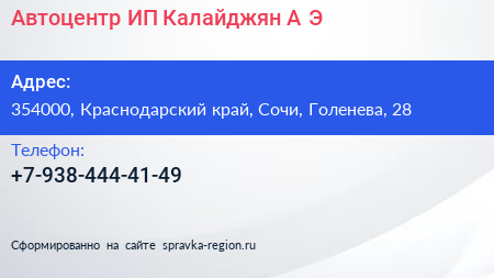 Автоцентр, ИП Калайджян А.Э. по адресу 354000, Краснодарский край, Сочи, Голенева, 28 в дальнейшем Организация, размещена в следующих категориях: