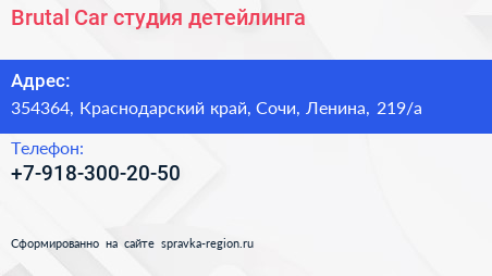 Brutal Car, студия детейлинга по адресу 354364, Краснодарский край, Сочи, Ленина, 219/а в дальнейшем Организация, размещена в следующих категориях: