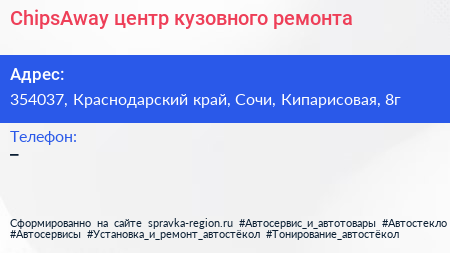 ChipsAway, центр кузовного ремонта по адресу 354037, Краснодарский край, Сочи, Кипарисовая, 8г в дальнейшем Организация, размещена в следующих категориях: