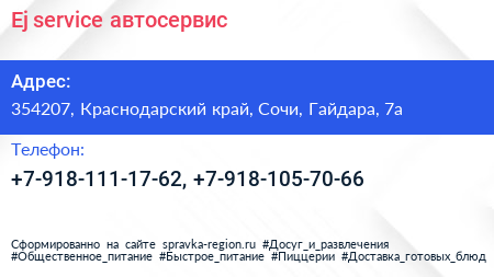 Ej service, автосервис по адресу 354207, Краснодарский край, Сочи, Гайдара, 7а в дальнейшем Организация, размещена в следующих категориях:
