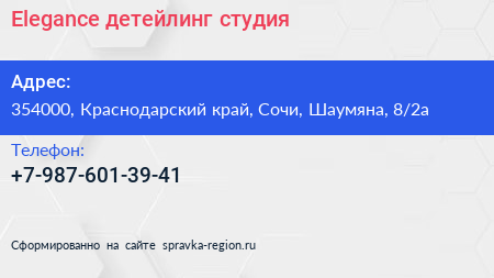 Elegance, детейлинг-студия по адресу 354000, Краснодарский край, Сочи, Шаумяна, 8/2а в дальнейшем Организация, размещена в следующих категориях: