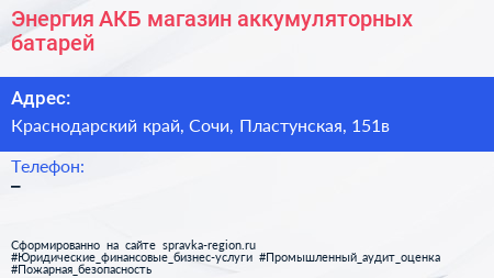 Энергия АКБ, магазин аккумуляторных батарей по адресу Краснодарский край, Сочи, Пластунская, 151в в дальнейшем Организация, размещена в следующих категориях: