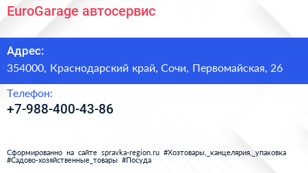 EuroGarage, автосервис по адресу 354000, Краснодарский край, Сочи, Первомайская, 26 в дальнейшем Организация, размещена в следующих категориях: