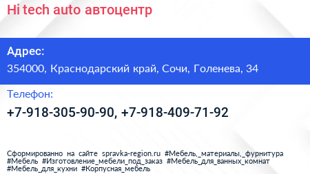 Hi-tech auto, автоцентр по адресу 354000, Краснодарский край, Сочи, Голенева, 34 в дальнейшем Организация, размещена в следующих категориях: