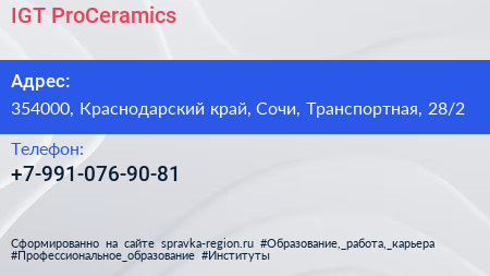 IGT ProCeramics по адресу 354000, Краснодарский край, Сочи, Транспортная, 28/2 в дальнейшем Организация, размещена в следующих категориях: