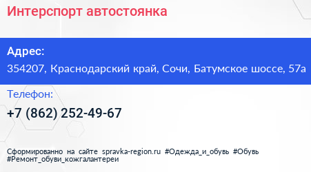 Интерспорт, автостоянка по адресу 354207, Краснодарский край, Сочи, Батумское шоссе, 57а в дальнейшем Организация, размещена в следующих категориях:
