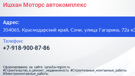 Ишхан Моторс, автокомплекс по адресу 354065, Краснодарский край, Сочи, улица Гагарина, 72а к3 в дальнейшем Организация, размещена в следующих категориях: