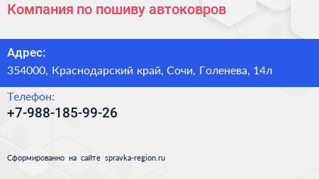 Компания по пошиву автоковров по адресу 354000, Краснодарский край, Сочи, Голенева, 14л в дальнейшем Организация, размещена в следующих категориях: