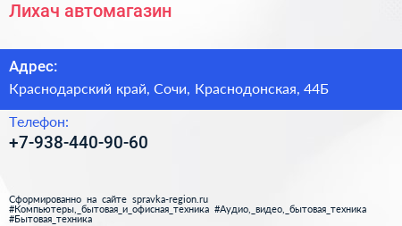 Лихач, автомагазин по адресу Краснодарский край, Сочи, Краснодонская, 44Б в дальнейшем Организация, размещена в следующих категориях:
