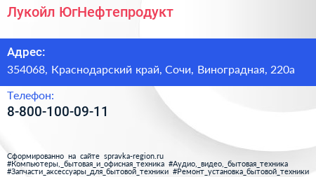 Лукойл-ЮгНефтепродукт по адресу 354068, Краснодарский край, Сочи, Виноградная, 220а в дальнейшем Организация, размещена в следующих категориях: