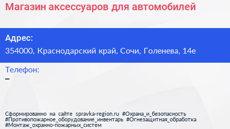 Магазин аксессуаров для автомобилей по адресу 354000, Краснодарский край, Сочи, Голенева, 14е в дальнейшем Организация, размещена в следующих категориях: