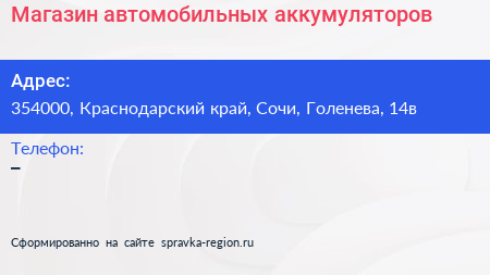Магазин автомобильных аккумуляторов по адресу 354000, Краснодарский край, Сочи, Голенева, 14в в дальнейшем Организация, размещена в следующих категориях: