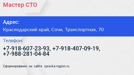 Мастер, СТО по адресу Краснодарский край, Сочи, Транспортная, 70 в дальнейшем Организация, размещена в следующих категориях: