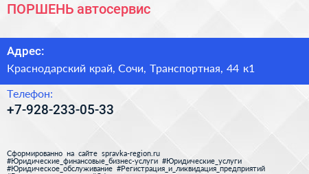 ПОРШЕНЬ, автосервис по адресу Краснодарский край, Сочи, Транспортная, 44 к1 в дальнейшем Организация, размещена в следующих категориях: