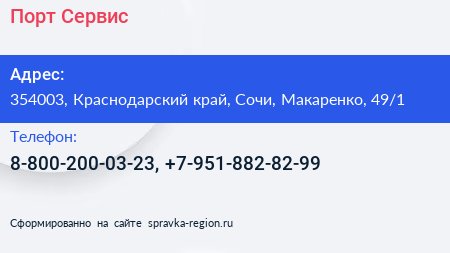 Порт Сервис по адресу 354003, Краснодарский край, Сочи, Макаренко, 49/1 в дальнейшем Организация, размещена в следующих категориях: