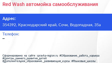 Red Wash, автомойка самообслуживания по адресу 354392, Краснодарский край, Сочи, Водопадная, 35а в дальнейшем Организация, размещена в следующих категориях: